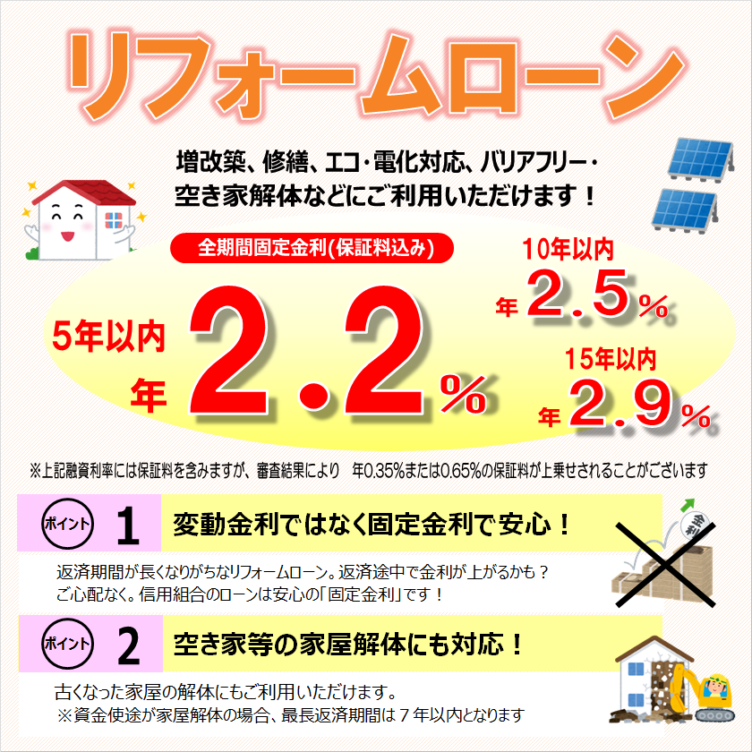 使いみち | リフォーム関連資金、他金融機関のリフォーム資金に関するローン、家屋解体に要する資金等 |