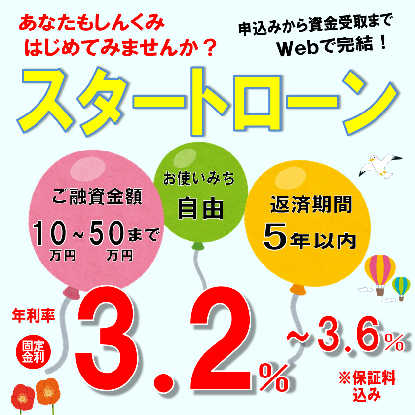 トップページ | 借りる | 小口フリーローン(スタートローン) ○Web仮審査型 Webお申込後、郵送またはご来店での正式な手続きが必要です。 ○Web完結型 お申込みからご契約まで全てネットでお手続き可能です。 スタートローン(Web仮審査型) お申込みはこちら スタートローン(Web完結型) お申込みはこちら 商品内容 金額 10万円以上50万円以内 使いみち 自由 期間 5年以内 融資利率 年3.2%~年3.6%(固定金利)※融資利率には保証料を含みますが、審査結果により年0.4%~年1.3%の保証料が上乗せされる場合がございます。 保証 ㈱ジャックス 商品概要説明書