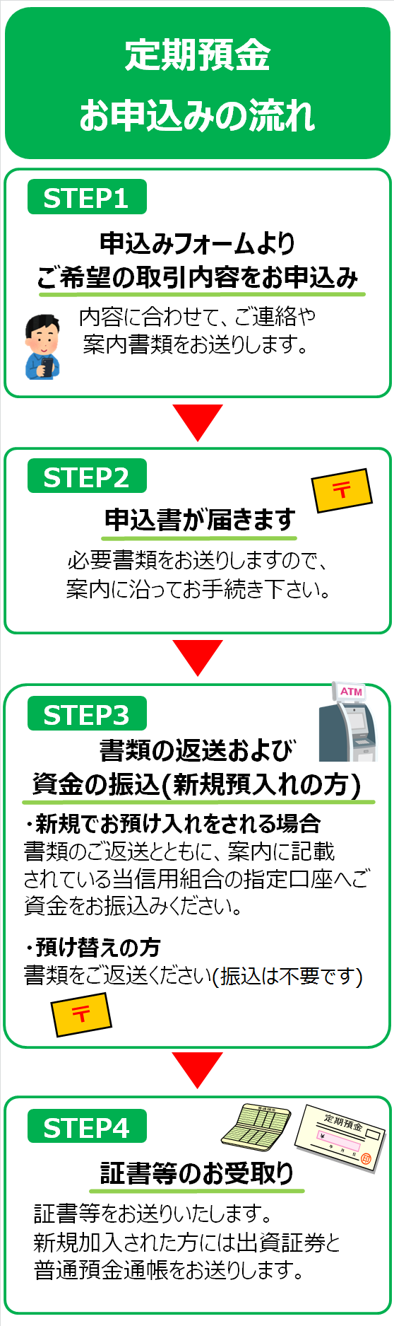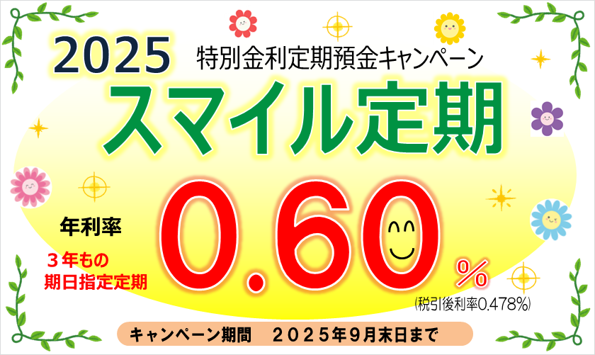 トップページ | 貯める | キャンペーン定期預金 来店せずにお申込みする場合、お振込みでのお預入となります。 その場合、振込手数料は最大550円まで当信用組合が負担します。 (当信用組合のご本人名義普通預金口座へキャッシュバック) 詳しくはこちらへ スマイル定期預金 ※お申込みの際の預入預金商品は「キャンペーン定期預金」をお選びください。 お申込みはこちら